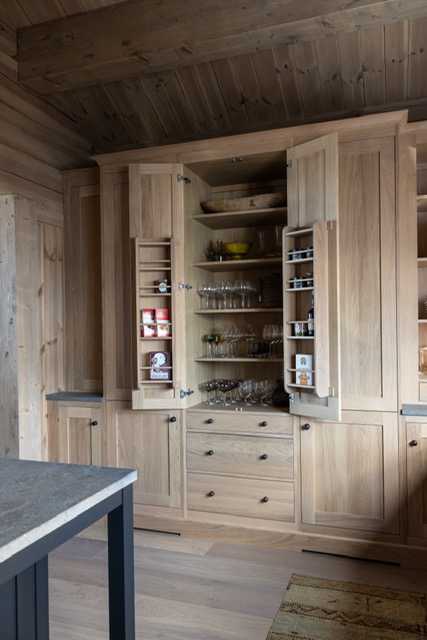 Vi arbetar med ask, björk, ek och valnöt. Träslagen är valda för styrka, stabilitet och hur de åldras. Du kan få olika ytbehandlingar och betsningar beroende på vilken ton du vill ha, från ljust och nordiskt till mörkare och mer markerat. Kombinationen av fingerskarvade lådor, rundade avslut, sockeldekor och takanpassade skåp ger ett kök som håller ihop både i form och funktion.